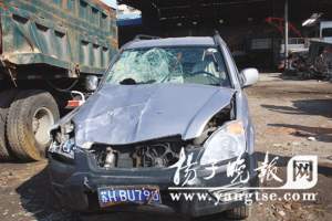 昨天上午在停車場,記者見到了肇事車輛:牌照為蘇HBU790雙環(huán)越野車,前擋風(fēng)玻璃半邊差不多被撞碎,上面還有一個大洞,直徑為49厘米,并且從碎裂的玻璃縫隙中提取了數(shù)根頭發(fā)。從車內(nèi)名片盒內(nèi),記者找到一張杜軍本人的名片,上面寫有“志圣科技(廣州)有限公司蘇中地區(qū)經(jīng)銷部工程師”字樣。據(jù)楚州區(qū)公安局交警大隊(duì)辦公室主任朱士能介紹,昨天上午杜軍血檢結(jié)果顯示,他屬于醉酒駕車,應(yīng)負(fù)事故全責(zé)。警方同時已安排人員到杜軍家讓他們盡快先拿出10萬元來做死者家人的安撫工作。一名不愿透露姓名的民警告訴記者,從事故發(fā)生時間以及杜軍的血檢結(jié)果來看,杜軍應(yīng)該是中午喝的酒。他同時告訴記者,該車在事故發(fā)生前還有一起闖紅燈,兩起違停行為。