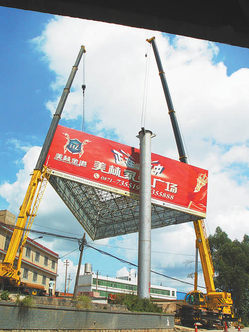 9月18日,記者在昆明國際會展中心附近看到,兩棵單立柱廣告牌正在被大吊車吊起。隨后幾天,記者在昆明的城南、城北地區(qū)都看到有關(guān)部門在拆除戶外廣告牌。記者從昆明市城管局獲悉,截至9月24日,昆明市主城區(qū)共拆除單立柱200棵。其中,五華區(qū)、高新區(qū)、度假區(qū)、呈貢已提前完成拆除任務(wù)。盤龍區(qū)、經(jīng)濟技術(shù)開發(fā)區(qū)也開始拆除高等級道路兩側(cè)的單立柱廣告。在昆明當?shù),剩余的單立柱廣告已經(jīng)屈指可數(shù)。