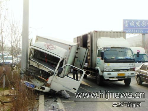 今日10時(shí)許,在哈市哈平路農(nóng)機(jī)研究院路段,一輛白色廂式貨車(chē)行駛中前方車(chē)輛突然減速,貨車(chē)剎車(chē)不及只能轉(zhuǎn)向躲避,沖上路面的隔離帶撞到一根鐵柱方才停下。貨車(chē)駕駛室嚴(yán)重變形,破碎的風(fēng)擋玻璃和機(jī)器零件散落一地,司機(jī)大腿被卡住。