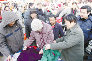 在一個(gè)小攤兒上,一位老大媽看上了一件毛衣,正在討價(jià)還價(jià),先前的兩個(gè)老人擠了上來。老漢擠住買毛衣的老大媽,老太太左手抓起一件毛衣作掩護(hù),右手伸進(jìn)了老大媽左側(cè)的口袋,把錢掏走了。