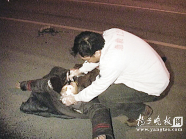 昨天凌晨0點(diǎn)35分,一輛由南向北行駛在南京揚(yáng)子江大道上的銀灰色速騰轎車,在開到定淮門大街的路口時(shí),突然將一名騎助力車身著保安制服的男子撞飛40多米外的車道上。頓時(shí)被撞保安不省人事。事情發(fā)生后,110民警接到報(bào)警立即通知了120救護(hù)車及交警五大隊(duì)到場處理。很快,民警臨時(shí)用路障將現(xiàn)場進(jìn)行保護(hù),此時(shí),那名穿著保安制服的中年男子仰面倒在地上,這名保安是南京鼓樓區(qū)保安公司的保安萬德華。醫(yī)護(hù)人員將他抬上車就近送往南京醫(yī)科大學(xué)第二附屬醫(yī)院搶救。