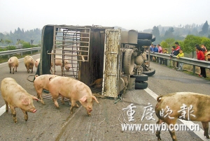昨日,豬販汪祥全受到處罰。來自市高速公路支隊的消息稱,近幾年,高速公路上不時出現運輸生豬貨車翻車后豬群亂串的狀況,其中曾有100多頭豬在成渝高速路亂串,先后引發(fā)4起車禍、3人受傷,道路封閉4小時。