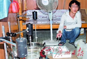 7月初,江門警方將“地主”販賣毒品的線索轉給佛山市公安局刑警支隊,但“地主”聞風潛伏,停止了制販毒活動。專案民警經過近4個月的深入摸查,發(fā)現該團伙不但販賣毒品,還利用家庭式作坊從事制造毒品活動。