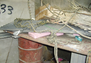 進(jìn)入工地大門(mén),記者看見(jiàn)了一個(gè)門(mén)衛(wèi)室,有一個(gè)圈著電纜的鐵環(huán)固定在屋檐下,工地上的工人表示,小偷被抓到后,就是被繩子捆住然后吊在這個(gè)鐵環(huán)上面的。而在門(mén)衛(wèi)室一旁還有一個(gè)狗窩,狗窩上散落著許多雜物,其中就有當(dāng)初用來(lái)捆小偷的繩子。在狗窩一旁,還有一口袋扣件,這就是小偷偷竊的工地東西,工人表示,這些扣件如果拿出去賣(mài),至少能賣(mài)百來(lái)元。對(duì)于用繩子捆住小偷又吊起來(lái),工地上的工人并沒(méi)有否認(rèn),“是有這回事,那么多人都看到了,后來(lái)警察來(lái)了,才放下來(lái)!”一位工人告訴記者,可是當(dāng)記者問(wèn)是誰(shuí)把小偷吊起來(lái)的時(shí)候,這名工人搖頭稱(chēng)不知道。