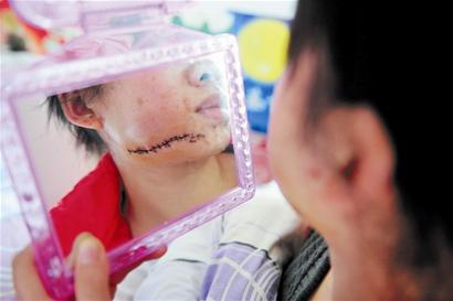 小瓊今年18歲,在馬巷車站附近一家臺球館當收銀員,前日下午記者在她家里看到了她,只見左臉下面有一道幾厘米長的傷口,被密密麻麻地縫了起來,足足有幾十針(圖)。