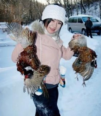 網(wǎng)帖中的女主角五官清秀、打扮入時(shí),她雙手提著中彈的野雞,對(duì)著鏡頭一臉微笑地?cái)[起了POSE。另一張照片是特寫,“狩獵女”的淡粉色外套沾滿了獵物的血跡。