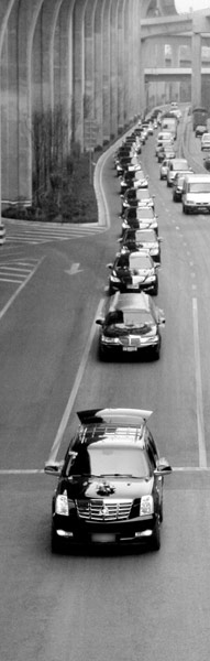 加長林肯開道,后面緊跟著20余輛保時捷卡宴、奔馳、寶馬;用于婚禮拍攝的則是一輛凱迪拉克越野車……這個超豪華的婚禮車隊昨天浩浩蕩蕩地出現(xiàn)在穿金路上,綿延數(shù)百米。如此壯觀的場景,吸引了不少路人羨慕的目光。