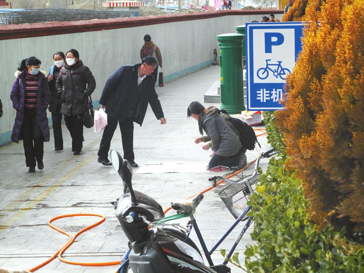 然而,當其中一個女孩看到記者正在遠處掏出相機拍照時,顧不得接過市民遞過來的錢,連忙用手遮著臉,拉著另一個女孩迅速站起來收拾東西,然后飛快地離開了現(xiàn)場。