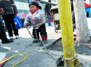 事件:因家中孩子無(wú)人照看,一名開摩的男子將兩歲的兒子用鐵鏈拴在路邊柱子上。