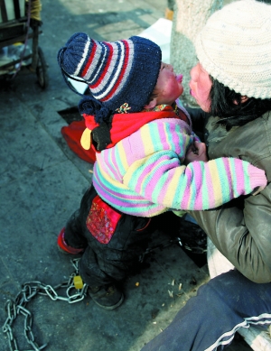 昨日,房山良鄉(xiāng)華冠購(gòu)物中心西側(cè),陳傳六正在趴活,臉上有多處凍瘡。距摩的兩米遠(yuǎn)的路牌子下鋪著紙板,放著簡(jiǎn)易童車。他兩歲的兒子坐在紙板上喝著冷奶,奶嘴發(fā)黑。一名黑車司機(jī)朝小孩喊“金蛋兒”,小孩朝他笑。