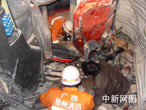 柳州鹿寨消防中隊接警后,立即出動一輛搶險救援車和6名官兵趕往事故現(xiàn)場。在現(xiàn)場,已聚集了眾多民眾,公安、120醫(yī)護(hù)人員已經(jīng)到場。此時出事貨車車身已“霸占”了三個門面,車頭鉆入一修理店店鋪,地上散落著鐵礦和從屋頂?shù)袈涞氖尥摺?/p>
