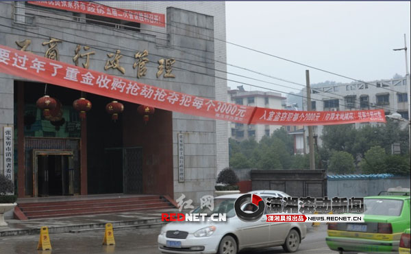 2月7日下午,記者聯(lián)系了張家界南莊坪辦事處,分管政法工作的張副主任和一位彭姓工作人員介紹,標(biāo)語確實(shí)是他們掛的,“我們區(qū)里面(永定區(qū)政法委)對抓獲兩搶一盜的都有獎勵,抓獲一個分別為5000元和1000元,而辦事處為了更大程度上獎勵見義勇為者,分別在相應(yīng)基礎(chǔ)上增加獎勵3000元和1000元,前段時間有人抓獲兩個搶劫犯的,都有兌現(xiàn)了,在開始‘冬季嚴(yán)打’活動以來就掛出這個標(biāo)語了!”