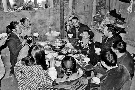 “快點(diǎn)烤一會(huì)兒再去泡個(gè)熱水澡。你娃兒他媽老早就給你燒好了洗澡水。完了出來吃團(tuán)年飯,我們一直在等你!崩细赣H幫譚崇文一邊卸著包袱一邊說。