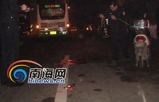 南海網(wǎng)記者趕到事發(fā)現(xiàn)場后,一輛牌號為“瓊A·19103”的26路公交車后方,留有一大灘血跡及一輛倒下的電動車,26路公交車右后輪上還留有白色與紅色混合的液狀物體,車停下來的位置離男子倒地位置有約十米左右的距離,交警正在現(xiàn)場勘查。