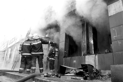 7時許,記者在現(xiàn)場看到,一家經(jīng)營變頻器的門市房內(nèi)冒出滾滾濃煙,火借風勢很快將樓上一家旅店引燃,消防人員正在二層破拆打水撲救,并迅速將屋內(nèi)的煤氣罐轉(zhuǎn)移,二層的近10扇窗戶玻璃被擊碎排煙。經(jīng)過兩個小時的救援,火勢被控制住。此時,門市房受損嚴重,室內(nèi)的物品被燒焦,窗戶玻璃破碎。人行道及車行道上的積水結(jié)了一層薄冰。