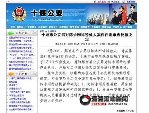 今日零點(3月10日),瀟湘晨報滾動新聞記者在湖北省十堰市公安局官方網(wǎng)站上發(fā)現(xiàn)一則通告,稱經(jīng)復核,撤銷撤銷對陳永剛的拘留決定,并向陳賠禮道歉、國家賠償,同時追究相關(guān)責任認責任。