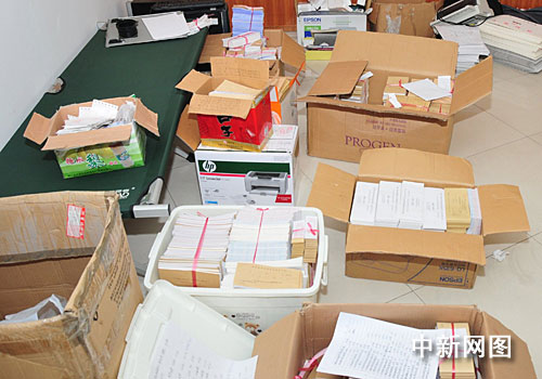 據(jù)悉,警方共奔赴13個抓捕點。記者在一個抓捕點看到,除了一張上下鋪鋼絲床,其余地方都被各類的紙箱占據(jù)。民警隨意打開地上的紙箱,里面都是各式各樣的假發(fā)票,不僅是浙江省范圍內(nèi)的,上海、山東、江蘇等地的假發(fā)票也隨地都是。經(jīng)清點,民警一共繳獲各類假發(fā)票21.3萬份,同時還繳獲了3套電腦、打印機、掃描儀等印制發(fā)票用普通設(shè)備以及400余枚開具假發(fā)票所使用的偽造公章、假證等作案工具。