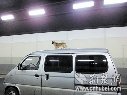 在一輛快速行駛的面包車的頂上,站著一只小狗。昨日,一組標(biāo)題為“武漢長(zhǎng)江隧道內(nèi)虐狗門事”的照片出現(xiàn)在網(wǎng)上。