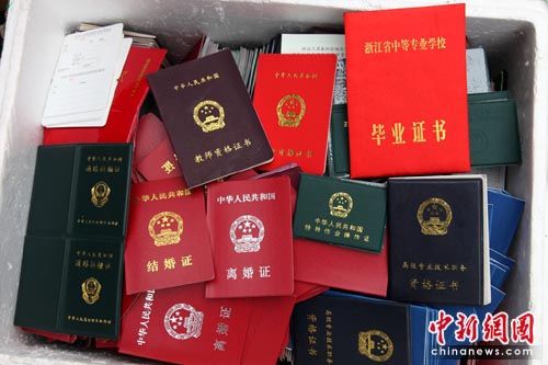 中新網(wǎng)舟山4月4日電(記者 趙曄嬌 通訊員 夏方)2日中午,浙江舟山市定海警方搗毀一特大造假證窩點,繳獲數(shù)千本半成品假證件,涉及駕駛證、結(jié)婚證、房產(chǎn)證、軍官證、健康證、運輸證等30多個種類,可謂包羅萬象。其中,以各類學歷證書、英語等級證書出貨量最大。