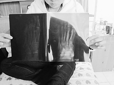 據(jù)李女士介紹,3月6日,她和丈夫一同去廣場(chǎng)南口金夫人婚紗影樓拍婚紗照。進(jìn)攝影棚后,攝影師要求她光腳坐在一臺(tái)鋼琴旁的長(zhǎng)板凳上拍攝。拍完這張照片后,攝影師又讓她往后站點(diǎn),由于婚紗有近2米長(zhǎng),正當(dāng)她起身往后退時(shí),長(zhǎng)長(zhǎng)的婚紗將鋼琴旁的長(zhǎng)板凳拖倒在地,板凳重重地砸在她的左腳腳趾上,她頓時(shí)感到萬(wàn)般劇痛。然而攝影師的助理只是簡(jiǎn)單問(wèn)了問(wèn)傷勢(shì),并買來(lái)云南白藥噴在她腳上,她忍著劇痛繼續(xù)拍完最后一組婚紗照。晚上10時(shí)許,她和丈夫回到家中,才發(fā)現(xiàn)腳腫得很厲害。經(jīng)在雁灘骨傷科醫(yī)院檢查,左腳第5根腳趾斷裂。