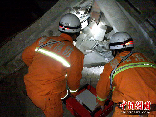 4月15日,玉樹縣結(jié)古鎮(zhèn)氣象賓館旁的民房,肖國(guó)平和白云飛的視頻生命探測(cè)儀發(fā)揮了作用。據(jù)群眾反應(yīng),這里有被埋人員,肖國(guó)平與白云飛立即就沖了上去。這幢民房整體坍塌,他們?cè)趶U墟里仔細(xì)探尋,殘?jiān)珨啾诼冻龅蔫F釘、鋼筋、瓦礫讓他們行動(dòng)困難,臉劃破了全然不顧。然而一分一秒過去了,儀器上遲遲沒有發(fā)現(xiàn)生命跡象,但他們沒有放棄,繼續(xù)將視頻探頭深入廢墟中,最終在一個(gè)倒塌的墻體下發(fā)現(xiàn)疑似人體的跡象。