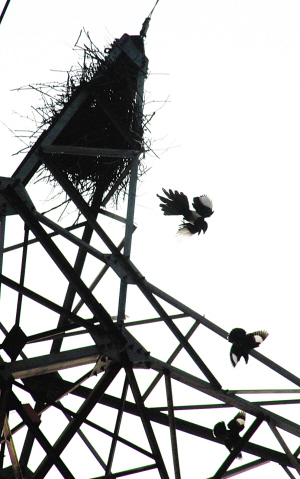 附近的居民武先生告訴記者,就在半個(gè)月前,他散步路過這座高壓電線架下,忽然有一根細(xì)樹枝從空中掉了下來,隨之聽到上面?zhèn)鱽硪魂囮噽偠镍B叫聲。抬頭一看,發(fā)現(xiàn)是兩只喜鵲銜著樹枝站在電線架頂部的鋼架上,像是在討論什么似的——估計(jì)這是一對夫妻,它們開始搭窩了。