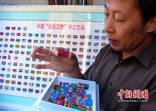 中新網(wǎng)4月30日電(馮文芳)為迎接舉世矚目的上海世博會,山西侯馬工程師郝建安用直徑為0.78毫米的彩色電纜線,制作出方寸大小的世界各國國旗,喜迎上海世博會。他編制的國旗結(jié)構(gòu)緊湊,造型嚴(yán)謹(jǐn),微觀寫意,巧妙夸張,富有立體感。