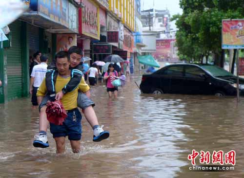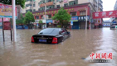 新化縣城從6日凌晨1時起,暴雨一直持續(xù)下到早上9時多。上午8時,受暴雨影響,新化縣城區(qū)寬闊的街道已經(jīng)變成了洶涌的河面,走在地勢較低的街面淹至人大腿。很多市民為了趕著上班,冒險涉水通過。一些汽車因為發(fā)動機(jī)進(jìn)水,拋錨停在道路上。