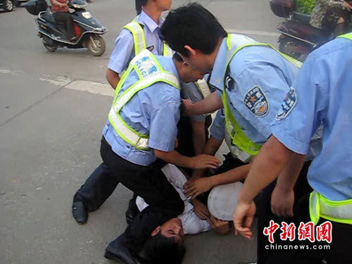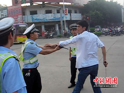 該司機(jī)在返回現(xiàn)場接受處理時直接質(zhì)問民警:“現(xiàn)在已經(jīng)是傍晚6點(diǎn)30分了,我的車為什么還不能過?”情緒異常激動的他跟本聽不進(jìn)執(zhí)勤民警的任何解釋和勸導(dǎo)。隨后,該司機(jī)回到貨車駕駛室內(nèi)拿來一把長約一米的大砍刀,徑直來到中山崗紅綠燈路口就想沖上前欲砍民警。