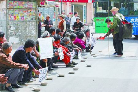 昨日上午,東風(fēng)路省中醫(yī)院門前,30名農(nóng)民工手持瓷碗,在路邊排成一行乞討,不少市民出于同情,為農(nóng)民工留下一些零錢。