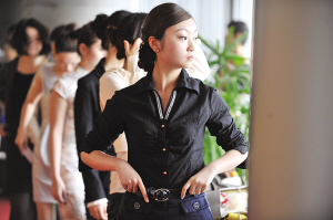 候場區(qū),美女云集的地方,只要一個轉(zhuǎn)身,你就可以看見近千名佳麗有的在偷偷補(bǔ)妝,有的對著鏡子練習(xí)微笑。在等候面試的美女中,有帶著綠色美瞳的美國加州留學(xué)生,有穿背帶褲剛剛高中畢業(yè)的學(xué)生,還有身著職業(yè)裝想換個工作的公司白領(lǐng)!艾F(xiàn)在工作不好找,所以只要有招聘就來試試咯!边@是記者在現(xiàn)場聽到最多的一句話。