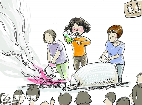 店主看到了過來阻攔,雙方發(fā)生了爭執(zhí)。很快,警察來了。百官派出所的金警官向記者證實(shí),當(dāng)時雙方的情緒都很激動。說起燒書,家長說,這實(shí)在是無奈之舉,“這樣的書不應(yīng)該在校門口賣,影響孩子的學(xué)習(xí)”。而店主則稱,他們是借給大人看的,這樣燒書影響他們的生意。