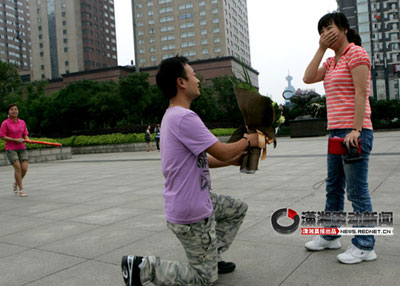 今日(6月1日)11點59分,女友到了。王樂捧著玫瑰走向女友,單膝下跪,對女友說:“老婆,嫁給我吧,我會用一生來好好照顧你,讓你幸福!眱扇穗S后擁抱在了一起。有意思的是,胡安萱看上去大大方方,王樂卻始終有些害羞。