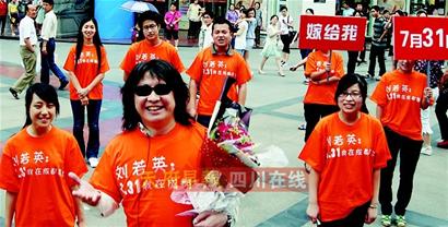 下午3時(shí),春熙路口出現(xiàn)一群身著橘色T恤衫的年輕人,T恤上印有“支持奶茶哥,7·31我在成都等你”等字樣。他們迅速排成一個(gè)“心”形隊(duì)列,手舉紅色的口號牌大喊:“劉若英,嫁給‘奶茶哥’吧!”“眼尖”的市民立馬就認(rèn)出了站在隊(duì)伍最前面的“莫扎特趙”,就是現(xiàn)在廣為成都市民所熟知的“奶茶哥”。“奶茶哥”戴著墨鏡,身穿橘色T恤、白色休閑褲,手上捧著一大束玫瑰花,看起來心情不錯(cuò)。