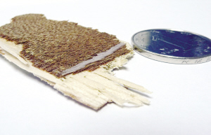 記者看到304室北面小屋的門(mén),有一部分用牛皮紙貼上,輕輕撕開(kāi)紙,赫然出現(xiàn)一個(gè)大洞。她說(shuō)這是有天早晨喊女兒起床時(shí)敲通的。一個(gè)年過(guò)半百的女子,竟然敲門(mén)時(shí)就輕易地把門(mén)敲通,可見(jiàn)這門(mén)板的質(zhì)量。果然,記者很輕易就掰下一塊面板,這種復(fù)合木板的厚度不到3毫米,難怪經(jīng)不起“敲”。
