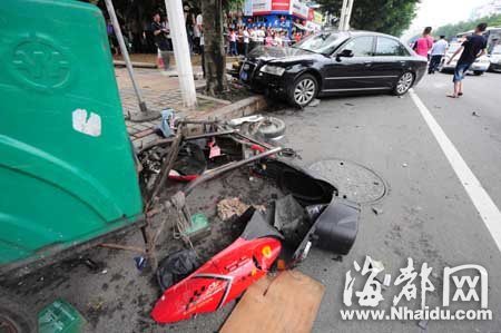 目擊者鄭小姐說,當(dāng)時她騎著電動車,在豪華轎車后面,與其同向行駛。豪華轎車先刮碰到一名騎自行車的女子,接著,非機(jī)動車道上一名騎摩托的男子和一名騎電動車的男子被撞飛,高度超越小車車頂,又重重摔到了人行道上。附近商家則說,豪華車是為躲避騎自行車的女子,打方向盤向右避讓,隨即撞上兩名騎車的男子!叭绻麤]這棵樹就慘了,可能更多人被撞!备呦壬男≤嚠(dāng)時就停在事發(fā)地附近等朋友。他說,他先是聽到一聲刺耳的剎車聲音,循聲看去,看到兩名騎車男子被撞飛。另有目擊者說,豪華車撞人后繼續(xù)往前沖,撞倒路邊的電話亭,再撞上行道樹后才停下。受傷的三人中,一人昏迷不醒,滿身是血。豪華車司機(jī)沒有受傷。