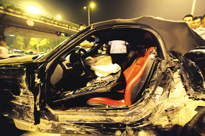 “乖乖,我跟在他后面說他要出事,這車開得像飛一樣,果不其然才一分鐘不到,真的出事了。”目擊市民王長來先生說,事發(fā)時這輛寶馬跑車從新街口方向,由東向西沿漢中路如飛一樣開去。由于車速很快,加上深夜寶馬跑車發(fā)出噪音,讓馬路上同方向車輛躲閃不及,其車子后面好像還有一輛超速跑車,王長來先生懷疑兩車在超速飆車。“市區(qū)內(nèi)貼地飛行能不出事嗎?”王長來說,他跟到漢中門長途汽車站門口,寶馬Z4敞篷跑車速度快得讓他吃驚,突然在漢中門高架下,這輛寶馬車與一輛本田商務(wù)車相撞,商務(wù)車左側(cè)車頭被撞得粉碎,寶馬車則丟失了自己的左側(cè)車門,騰空在原地打了一個180度轉(zhuǎn),原本車頭向西被撞擊后,車頭一下子朝東了。