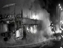 雙層大巴燒成空殼 車上67名乘客毫發(fā)未損