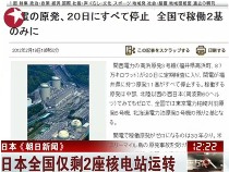 日本《朝日新聞》稱,目前日本全國僅剩2座核電站運轉(zhuǎn)。