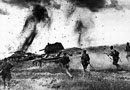 戰(zhàn)爭初期,蘇軍積極防御。1941年10月─1942年1月,蘇軍殲敵50多萬,取得了莫斯科會戰(zhàn)的勝利,使希特勒“閃電戰(zhàn)”慘遭失敗。1942年11月19日,蘇軍展開反攻,次年,迫使希特勒轉入戰(zhàn)略防御。