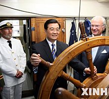 胡錦濤與瑞典國王出席"哥德堡"號仿古船返航儀式(6月10日03:52)