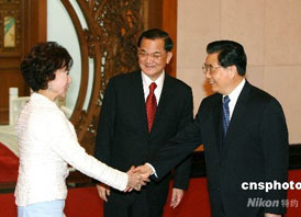 2005年4月29日,胡錦濤與連戰(zhàn)在北京舉行會談,共同發(fā)布兩岸和平發(fā)展共同愿景。 ·促進盡速恢復談判,共謀兩岸人民福祉 ·促進終止敵對狀態(tài),達成和平協(xié)議 ·促進兩岸經(jīng)濟全面交流,建立合作機制 ·促進協(xié)商臺民眾關(guān)心的參與國際活動問題 ·建立黨對黨定期溝通平臺 |