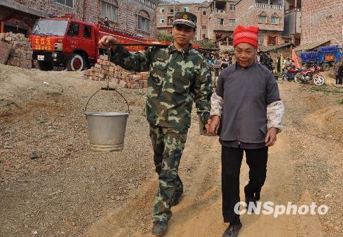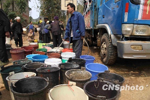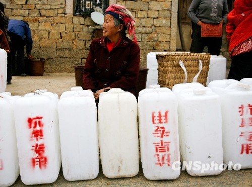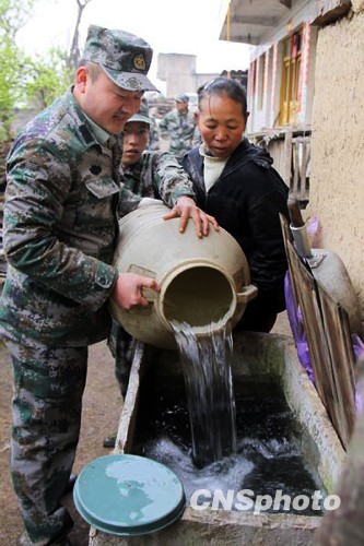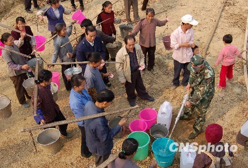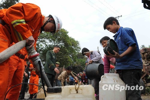 圖:消防官兵為貴州黔西南旱區(qū)百姓送水