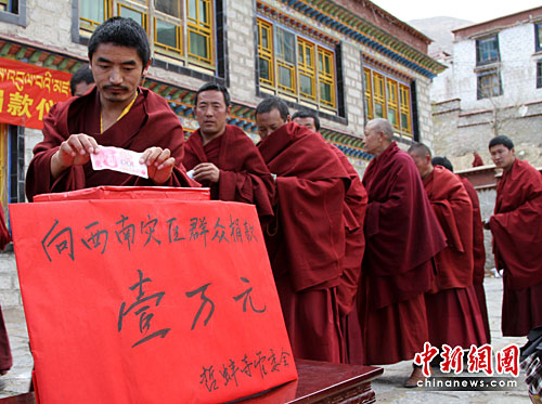 圖:拉薩哲蚌寺為中國西南旱災(zāi)地區(qū)捐款