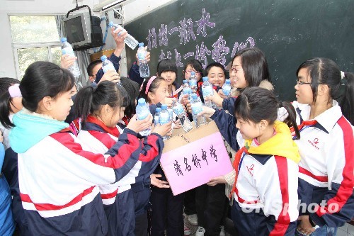 圖:江蘇無錫中學(xué)生開展向?yàn)?zāi)區(qū)捐水活動