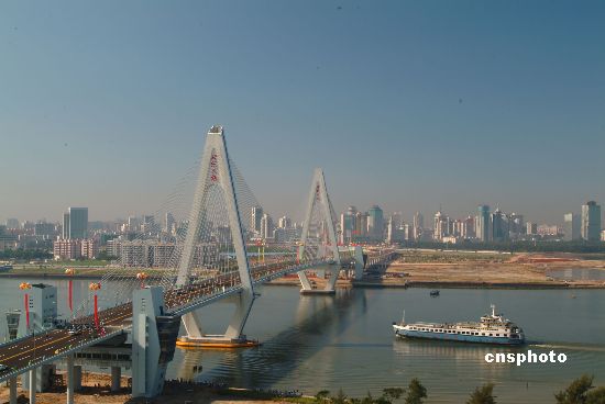 世紀大橋既是海南省重點建設項目,也是海口市標志性建筑物,由海口市路橋建設管理公司負責建設。大橋全長2663.606米,其中主橋長636.60米,主橋為雙塔雙索面三跨(147+340+147)連續(xù)預應力混凝土邊主梁斜拉橋,橋面寬29.8米,兩側(cè)設人行道。主塔呈鉆石型,塔高106.9米,主塔基礎為圓端型沉井,上口面積29.8米×18.6米,下口面積30.4米×19.2米,深40.1米,斜拉索每一單面22根,共176根。引橋為預應力混凝土連續(xù)箱梁,基礎采用預應力高強度混凝土管樁。南引橋長1101.094米,連接段233.867米;北引橋長524.45米,北引道167.595米,引橋?qū)?4.3米,兩側(cè)不設人行道。橋面為雙向6車道,設計行車速度為60公里/小時。主跨下最高水位4米時通航凈高為24米。主橋兩端共設4座塔樓,南北岸設橋頭廣場。