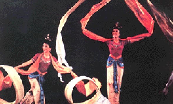 舞蹈《飛天》不僅是當(dāng)代中國第一部取材于敦煌壁畫的舞蹈作品,同時(shí)也是繼承戲曲中的長綢舞并加以發(fā)展、創(chuàng)新,使之成為獨(dú)立的純舞蹈藝術(shù)的第一部成功之作。從1954年首演至今,經(jīng)久不衰。