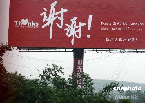 震區(qū)宣傳牌多國語言感謝中國和國際社會(huì)