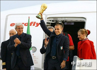 中新網(wǎng)7月12日電 據(jù)新京報(bào)報(bào)道,第四次登頂世界杯的意大利隊(duì)昨天凌晨乘坐專機(jī)回到了祖國,當(dāng)飛機(jī)在羅馬郊區(qū)的海軍機(jī)場著陸后,一場席卷意大利全國的慶;顒永_了序幕。意大利隊(duì)全體成員被授予共和國勛章。