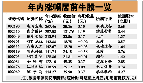 流通盤股本不大,是年內(nèi)牛股的又一大特點。前20名牛股中,中小板股票有8家,占四成。而流通股本超過2億股的只有7家;流通股本在2億股以下的有13家(含2億股),占全部20家公司的65%,其中,漲幅居前的幾只牛股中,有三只流通盤在7000萬股以下。大牛股東方園林(002310)是一只流通盤才2175萬股的袖珍小盤股(送股前),成飛集成總股本不過是2.06億股,流通股本6504萬股,是典型的“大行業(yè)、小公司”。(李成 )